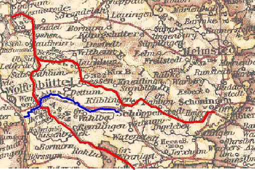 Kartenausschnitt (eigener Scan aus Andrees Handatlas 1906, Eigentum), selbst um Streckenführung (rot) und Altenauverlauf (blau) graphisch ergänzt. |