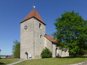 Der westliche Teil des Langhauses und der Kirchturm im Westen der Saalkirche sind im Kern romanisch. Das Langhaus wurde 1516 nach Osten und Süden erweitert. Das oberste Geschoss des Kirchturms beherbergt die Turmuhr und den Glockenstuhl. Der Innenraum des Langhauses wurde mit einem Tonnengewölbe mit Stichkappengewölben über den Bogenfenstern überspannt.