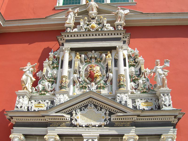 Portalschmuck am Juleum mit Universitätswappen in Helmstedt. Dazu fünf Figuren der sieben freie Künste: Figur „Astronomie“ mit Himmelskugel (Portalspitze), „Grammatik“ mit Griffel und Tafel (zweite Reihe links), „Arithmetik“ mit Tafel und Zahlen (zweite Reihe rechts), „Musik“ mit Laute (untere Reihe links) und „Geometrie“ mit Zirkel und Rolle (untere Reihe rechts). Fehlend: „Rhetorik“ und „Dialektik“ („Logik“).