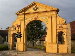 Der ursprünglich als Hauptportal des Klosters dienende Triumphbogen bildete die Einfahrt zur Klosterdomäne und liegt auf der Längsachse zum Taubenturm. Das Tor wurde während der Amtszeit des jeweiligen Abtes und Priors errichtet und zeigt im Giebel das kaiserliche Wappen sowie über den Seitendurchgängen deren Wappen.